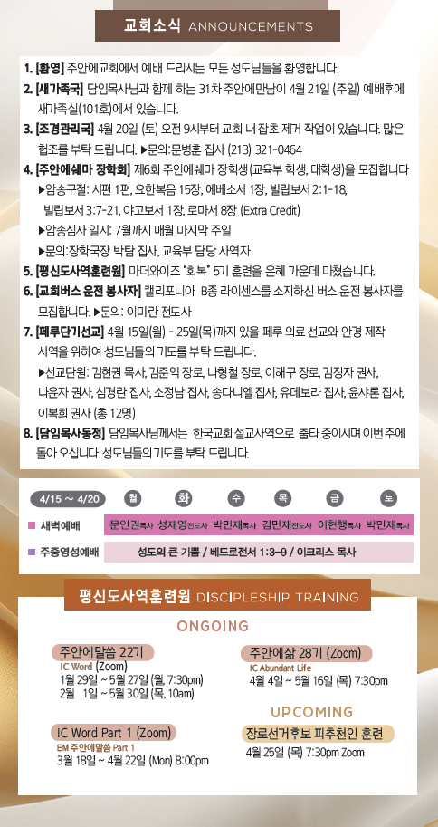주보 4월 14일 주보 Total 636건 9 페이지 주보 목록 4월 14일 주보 4월 7일 주보 3월 31일 주보 3월 24일 주보 3월 17일 주보 3월 10일 주보 3월 3일 주보 2월 25일 주보 2월 18일 주보 2월 11일 주보 처음 1페이지 2페이지 3페이지 4페이지 5페이지 6페이지 7페이지 8페이지 열린9페이지 10페이지 다음 맨끝